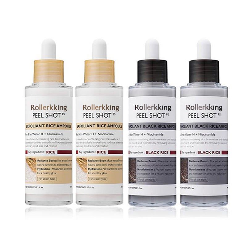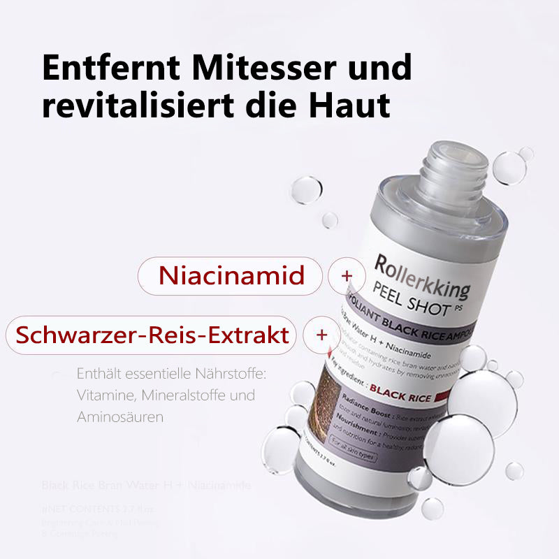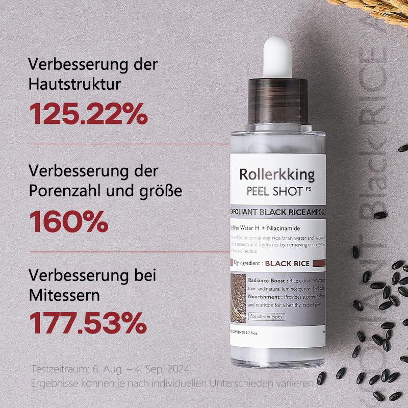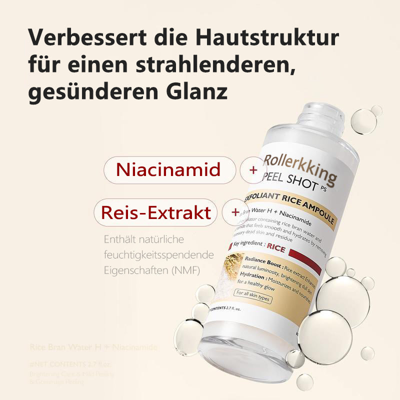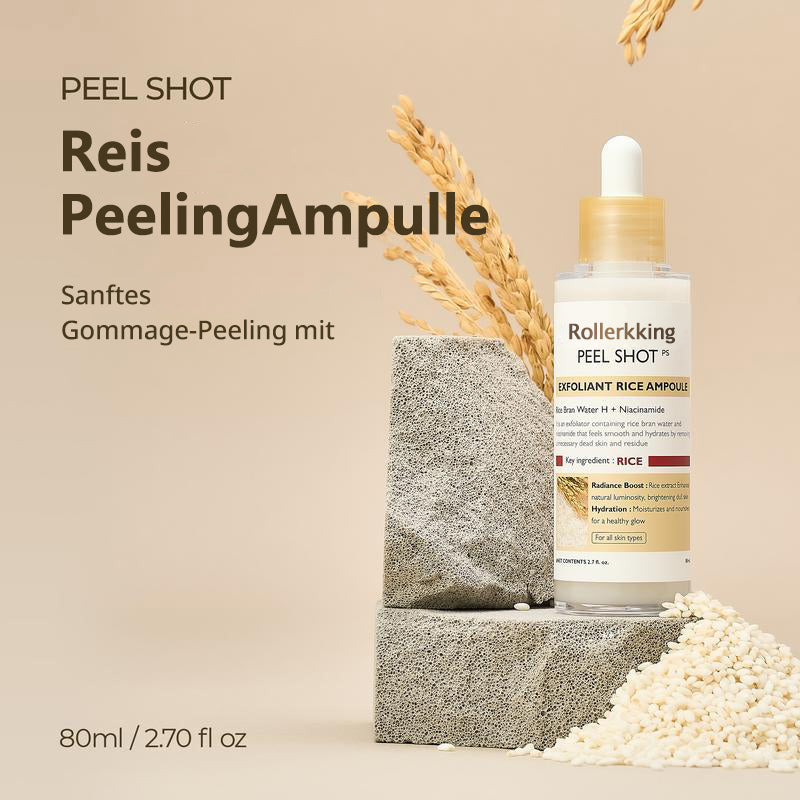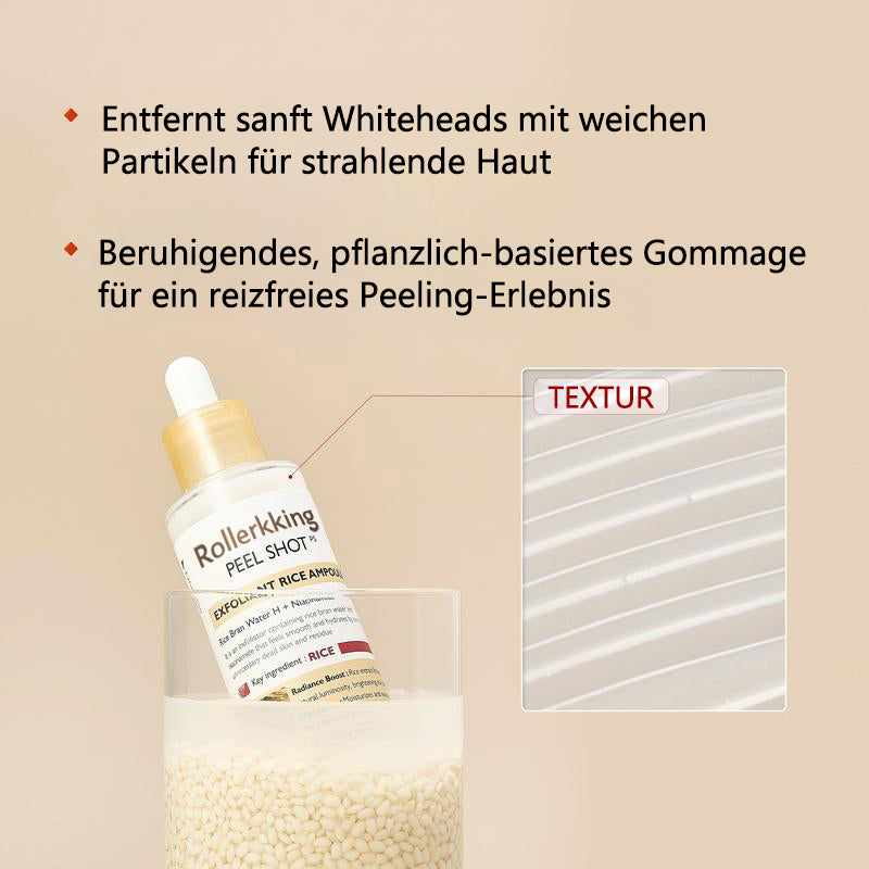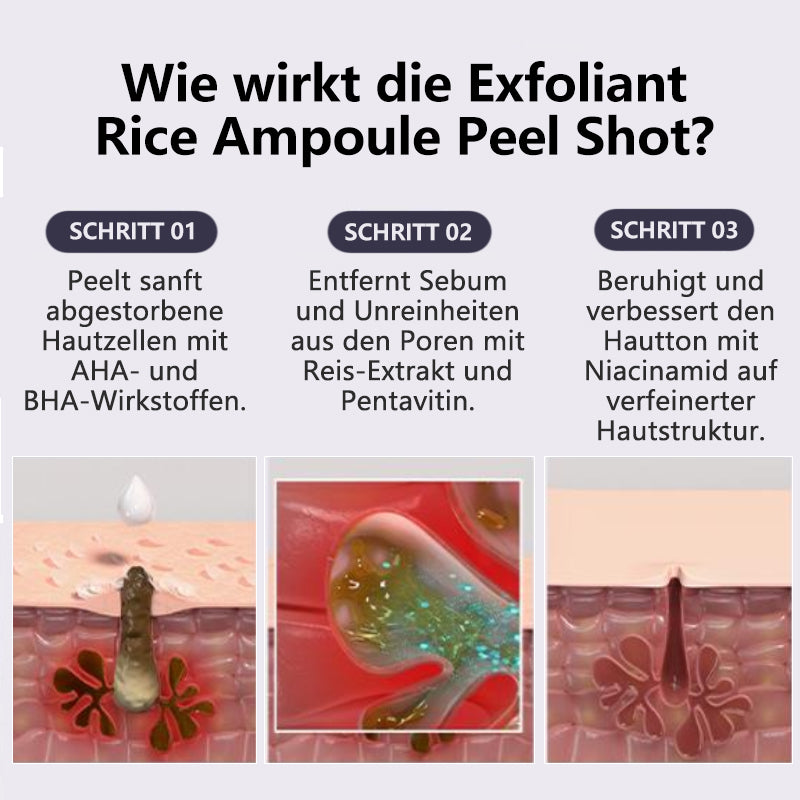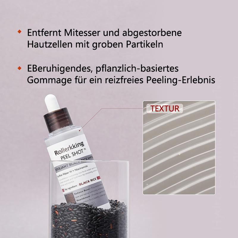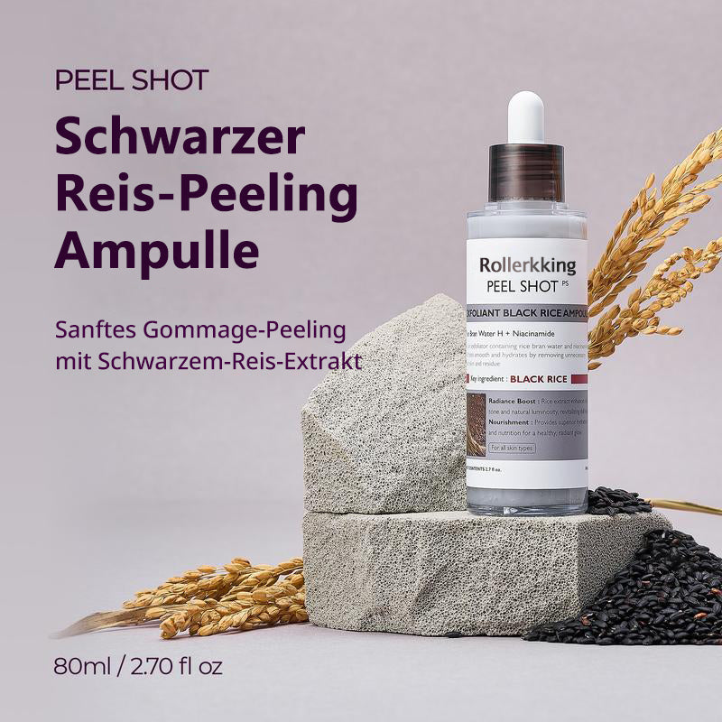 Unser Peel Shat Glow Rice Ampoule Duo kombiniert aufhellende Weißreis-Fermente mit kohleangereichertem Schwarreis-Extrakt und verstärkt diese mit Niacinamid, Arbutin und einem ausgewogenen 4-Säuren-Komplex. Beim Einmassieren rollen weiche Gommage-Perlen abgestorbene Zellen ab und lösen eingeschlossenes Öl; kurz darauf versorgen Pentavitin und dreifachmolekulare Hyaluronsäure reife Haut mit 72 Stunden Feuchtigkeit.