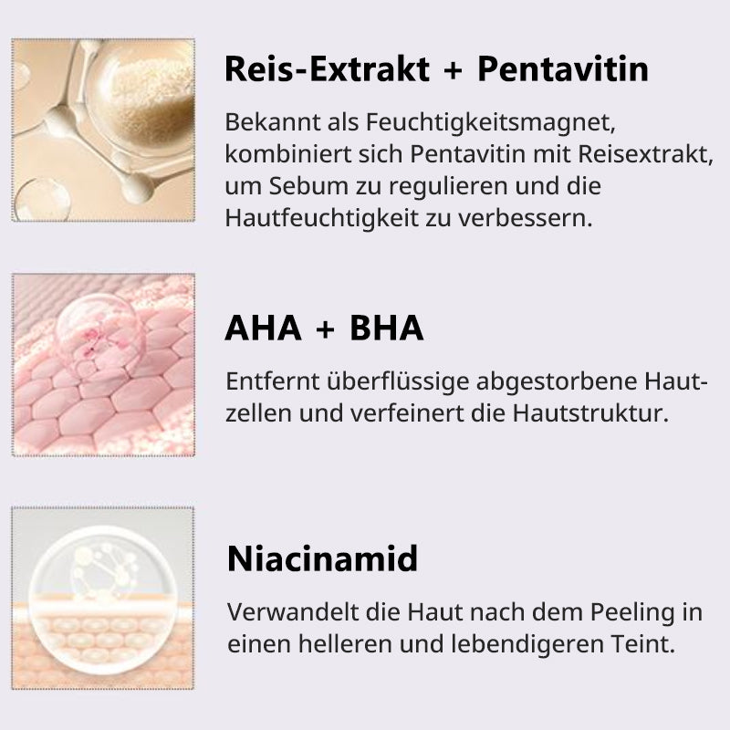 - Reiskleie-Nährstoffe & PENTAVITIN: Spenden tiefe Feuchtigkeit und Pflege nach dem Peeling.